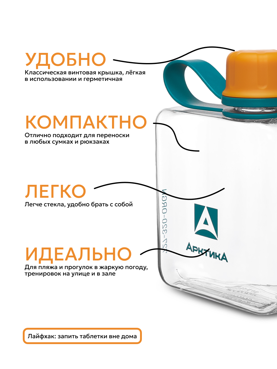 Тритан лучше всего подходит для простой питьевой воды — он не влияет на вкус и запах, не выделяет вредные вещества, такие как бисфенол-а (BPA free). Кроме того, винтовая крышка надежно защищает горлышко и содержимое бутылки от попадания грязи и пыли.
