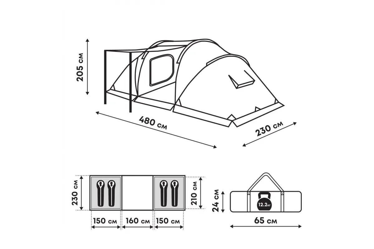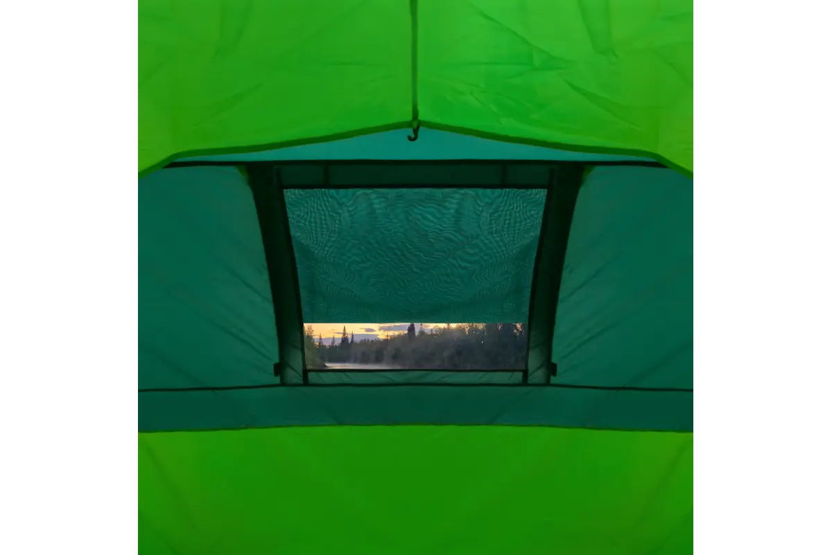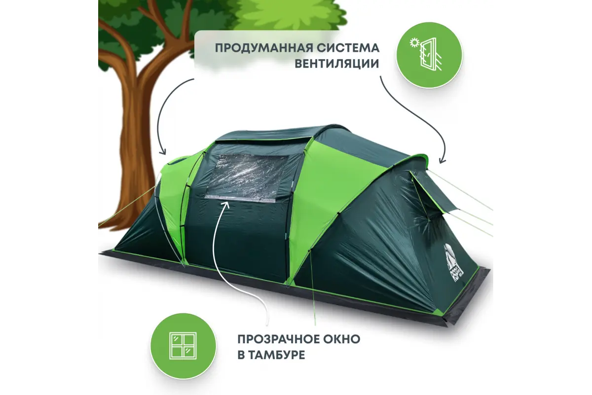 Палатка двухслойная, что обеспечивает хорошую вентиляцию и предотвращает скапливание конденсата. В середине палатки находится просторный тамбур, а справа и слева от него - спальные комнаты на 2 места каждая. В тамбуре предусмотрено прозрачное окно, которое можно открывать или закрывать специальной занавеской. Вход продублирован москитной сеткой, что в комплексе с юбкой, которая пришита по периметру, дает 100% защиту от насекомых.