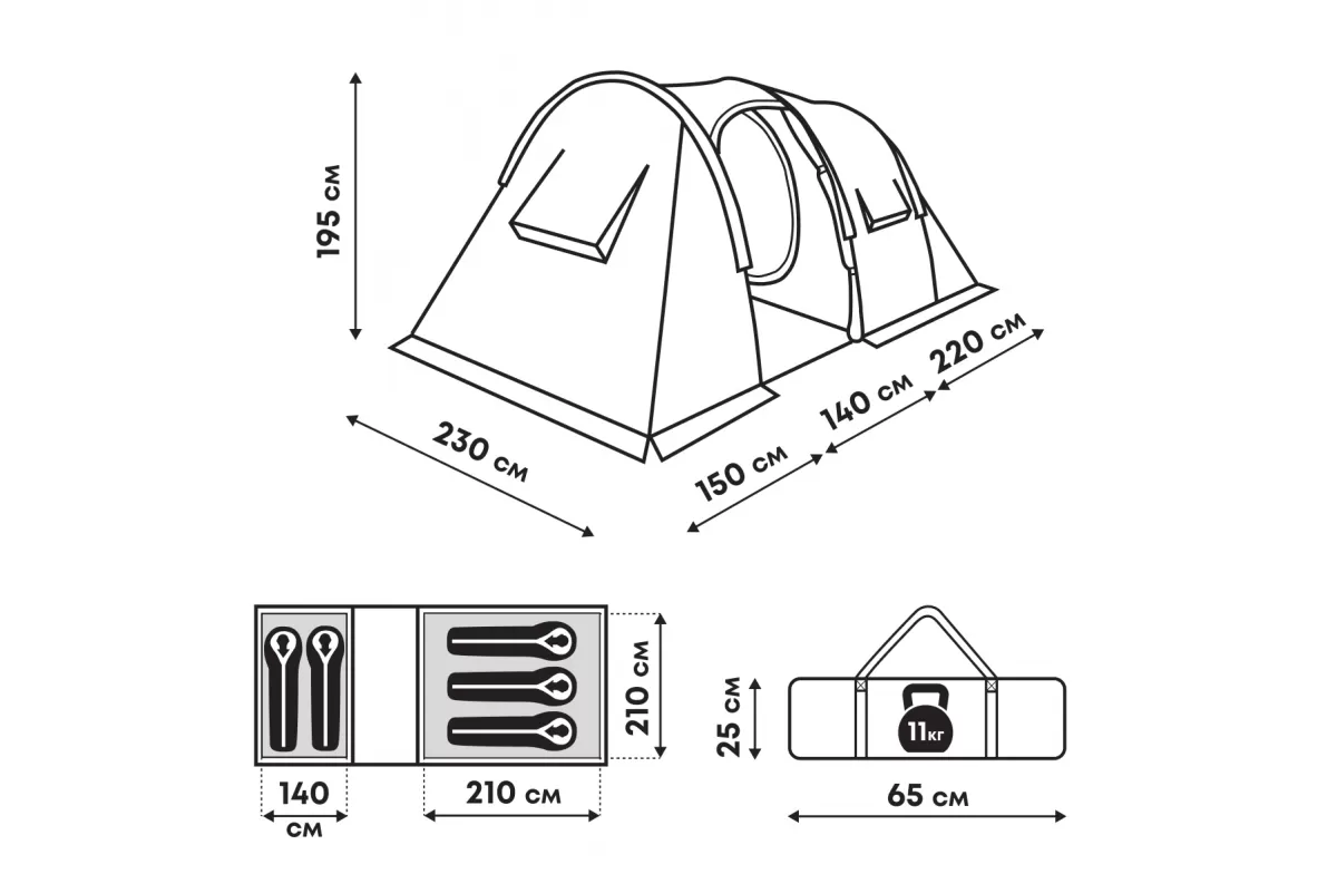 Материал | Материал тента: Полиэстер 210T, Материал внутренней палатки: Полиэстер, Материал дна: Терпаулинг |
