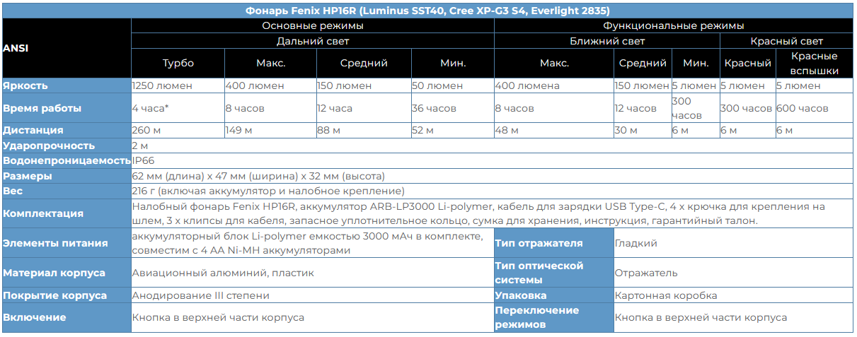 Налобный фонарь Fenix HP16R является перезаряжаемой высокопроизводительной моделью. Он обеспечивает пользователю яркость в 1250 люменов, а дальнобойность достигает 260 метров. Фонарь может работать в течение 300 часов в Минимальном режиме. Есть отдельный батарейный отсек, питание происходит от литий-полимерного аккумулятора Fenix ARB-LP3000. Также элементами питания могут быть четыре батареи Ni-MH/щелочные типа AA. Заряжать батареи нельзя. Аккумулятор заряжается через порт USB Type-C в батарейном отсеке. Чтобы полностью зарядить эту модель, потребуется 3 часа времени.