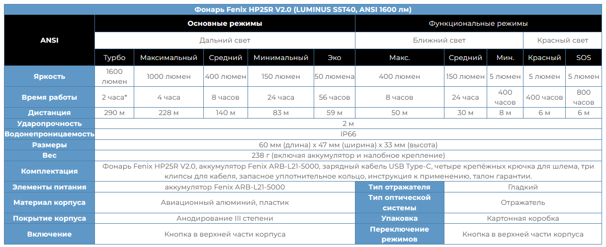 *Все показатели работы фонаря получены в ходе проведения лабораторной проверки. При таких условиях: использовали аккумулятор литий-ионный Fenix ARB-L21-5000, температура составляла порядка 21 +- 3 градуса Цельсия. Влажность воздуха – около 50-80 процентов. При других элементах питания и иных условиях среды параметры свечения могут отличаться от приведенных.