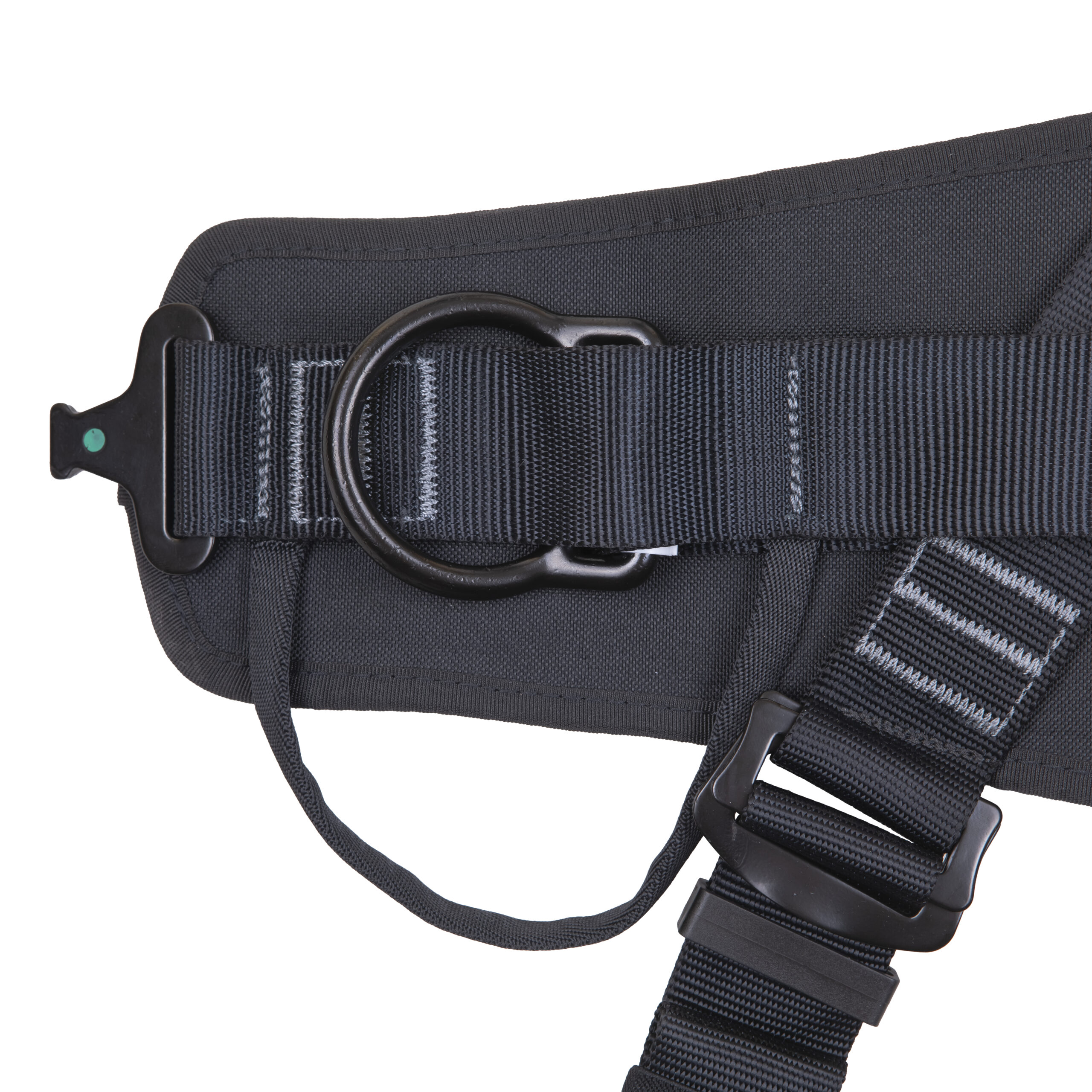 - Страховочная привязь имеет две точки крепления: передняя (на груди) и задняя — D-образные кольца — для присоединения к системе защиты от падения. Две боковые точки крепления (выгнутые D-образные кольца) на поясном ремне для работы в подпоре (при позиционировании). Брюшная точка крепления для работы в положении «сидя» — D-образное кольцо. Привязь предусматривает возможность интеграции зажима и рабочего сиденья для удобства пользователя.