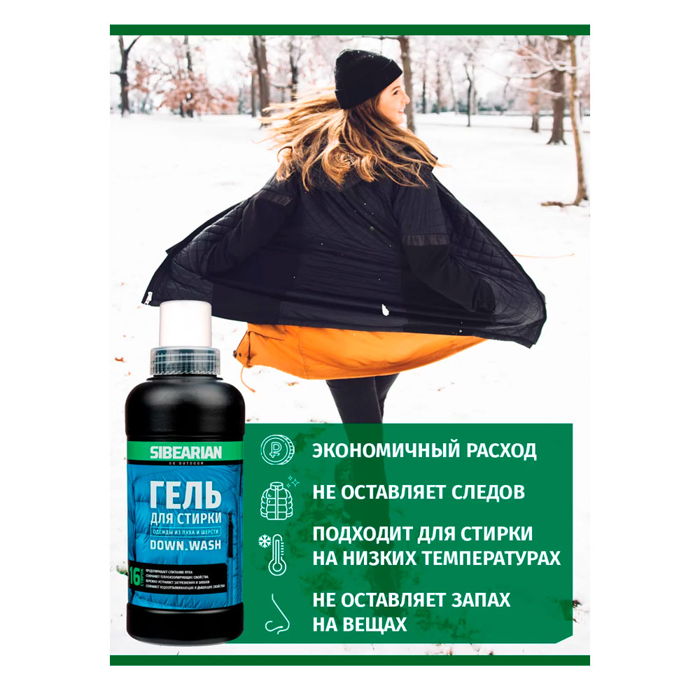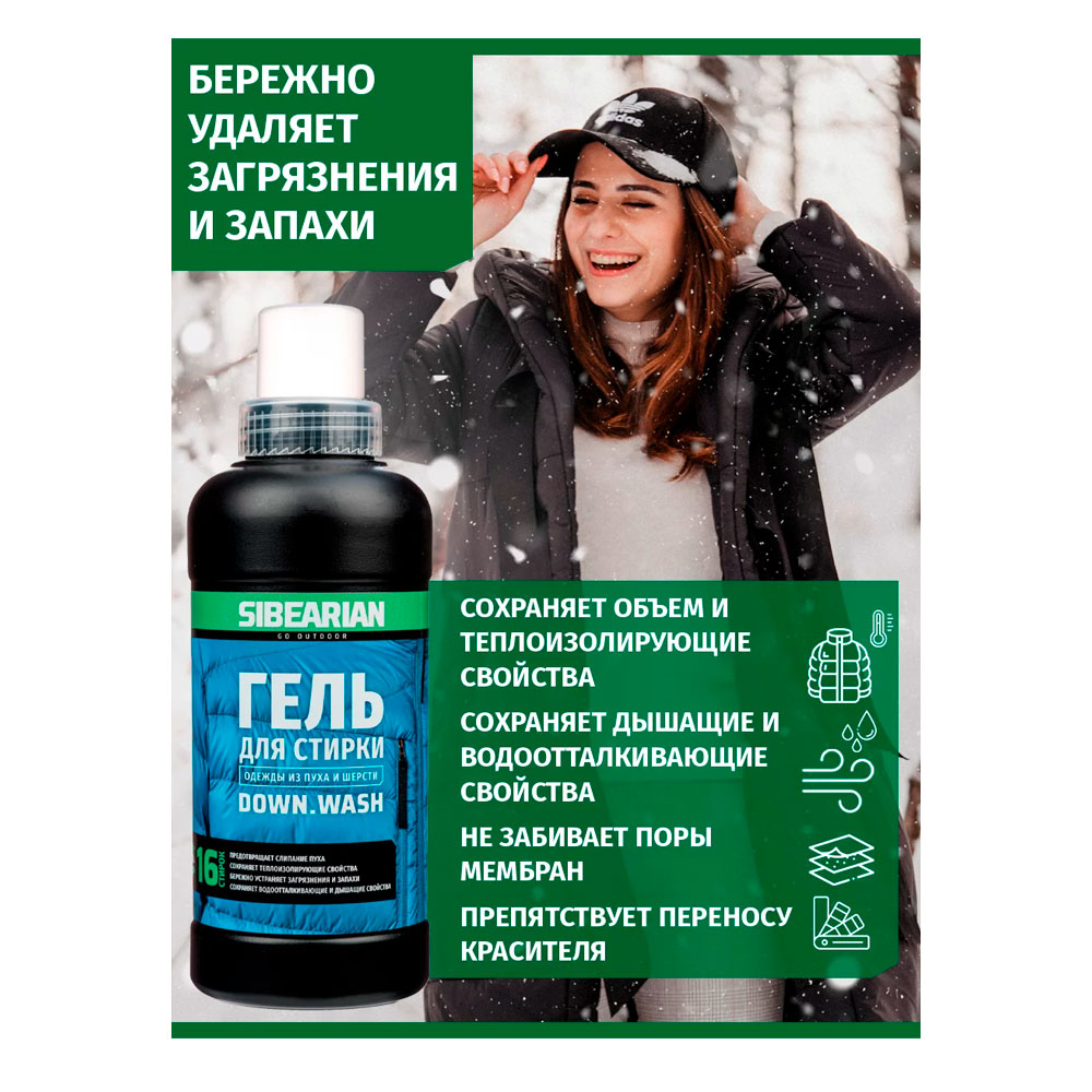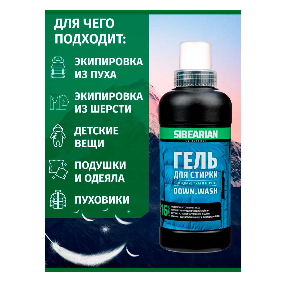 Sibearian Down Wash рекомендован для всех уровней активности — от профессиональных спортсменов и туристов до любителей активного отдыха. Подходит для мужчин, женщин и подростков, использующих одежду и снаряжение с пуховым утеплителем в любых погодных условиях.