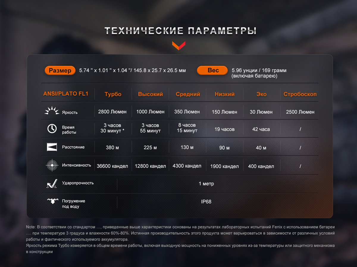 Отметим, что эти параметры работы фонаря удалось получить в ходе осуществления лабораторных опытов. Где использовали литий-ионный аккумулятор Fenix ARB-L21-5000 V2.0 при температуре 21 +- 3 градуса Цельсия и влажности 50%-80%. В случае иных условий внешней среды и применяемого аккумулятора показатели свечения будут отличаться.