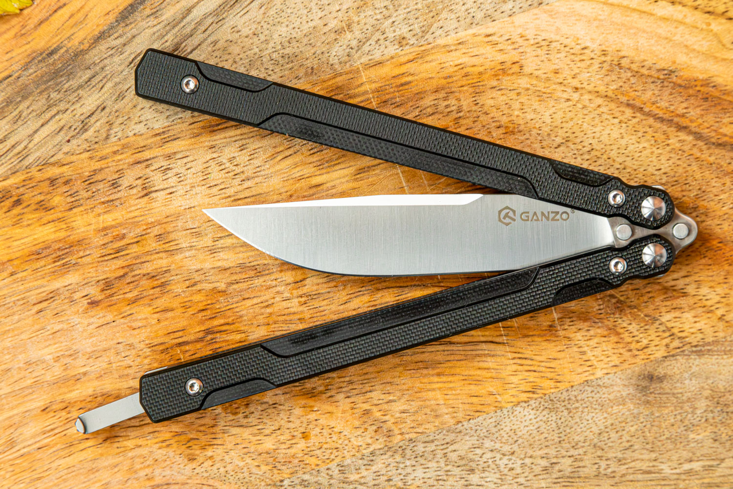 Рукоять ножа разделена надвое, что является характерной чертой балисонгов. Данная особенность позволяет быстро открыть нож одним взмахом руки, а также выполнять с его помощью различные трюки. Обе половины рукояти оснащены противоскользящими накладками из стеклотекстолита G10. Это распространенный среди ножей Ganzo материал, который превосходит обычный пластик в своей ударопрочности и может использоваться в любой среде вне зависимости от температуры воздуха. G10 легко окрашивается и надолго сохраняет яркий цвет, в том числе при воздействии ультрафиолетового освещения, нетребователен к уходу и стойко выдерживает влияние химических веществ.