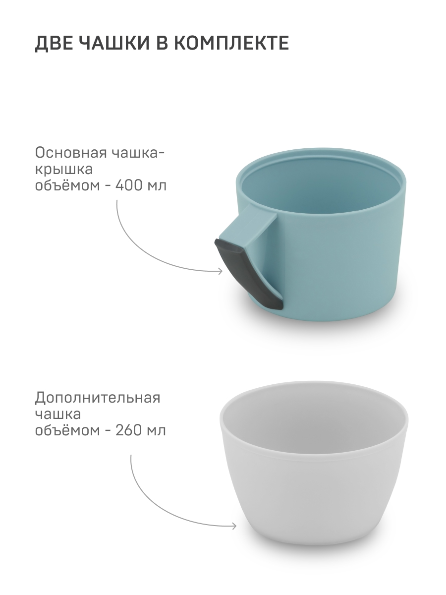Если вы взяли один термос на двоих, то вам не понадобится дополнительная кружка — вторая чашка уже в комплекте. Ручка, крышка и дно прорезинены от скольжения в руках и на столе.