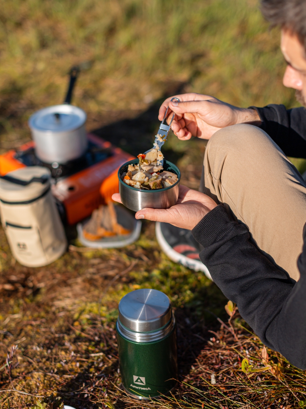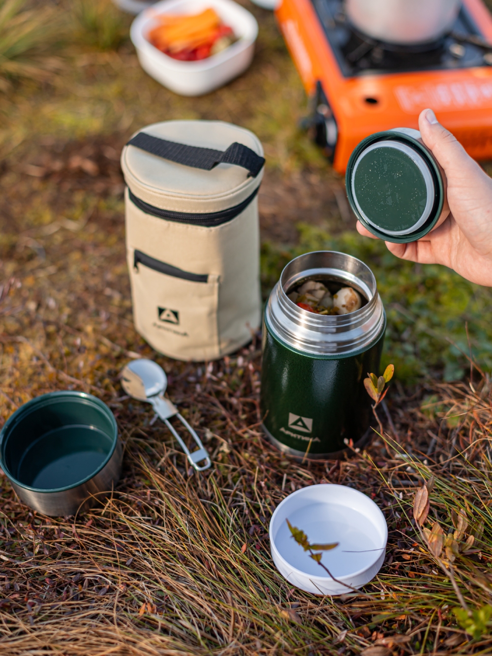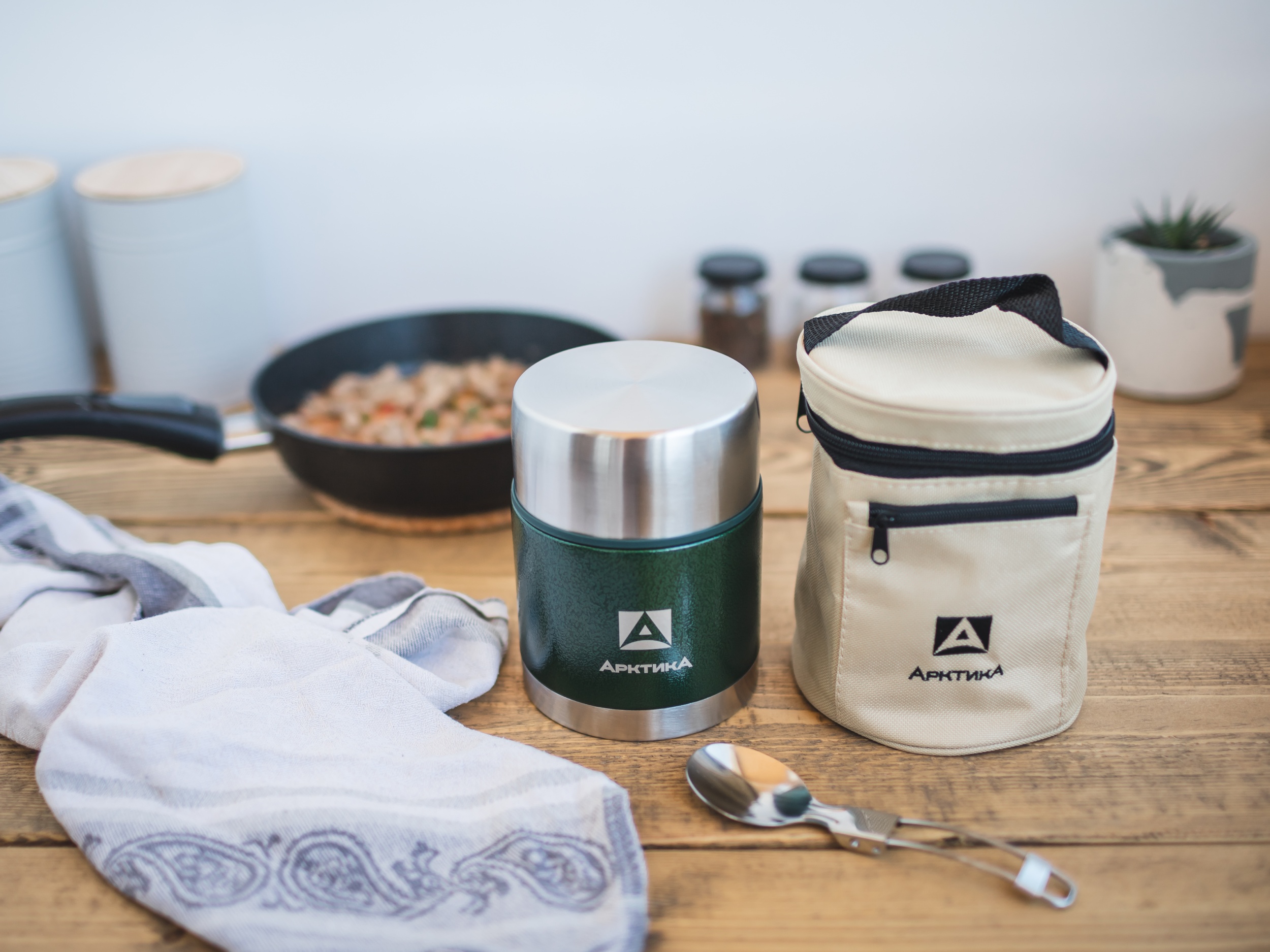 Готовый комплект для похода на природу: термос для еды с широким горлом и ударопрочным покрытием и легкая складная ложка.