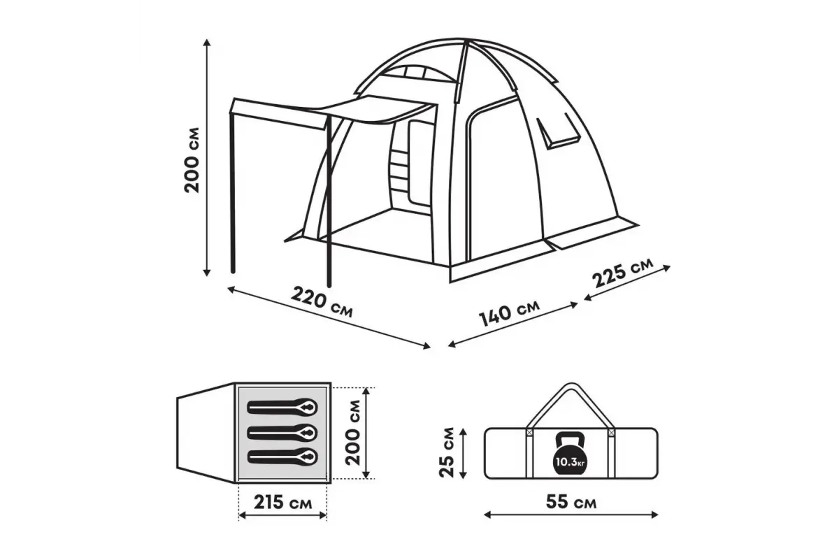 Материал | Материал тента: Полиэстер 210T, Материал внутренней палатки: Полиэстер, Материал дна: Терпаулинг |