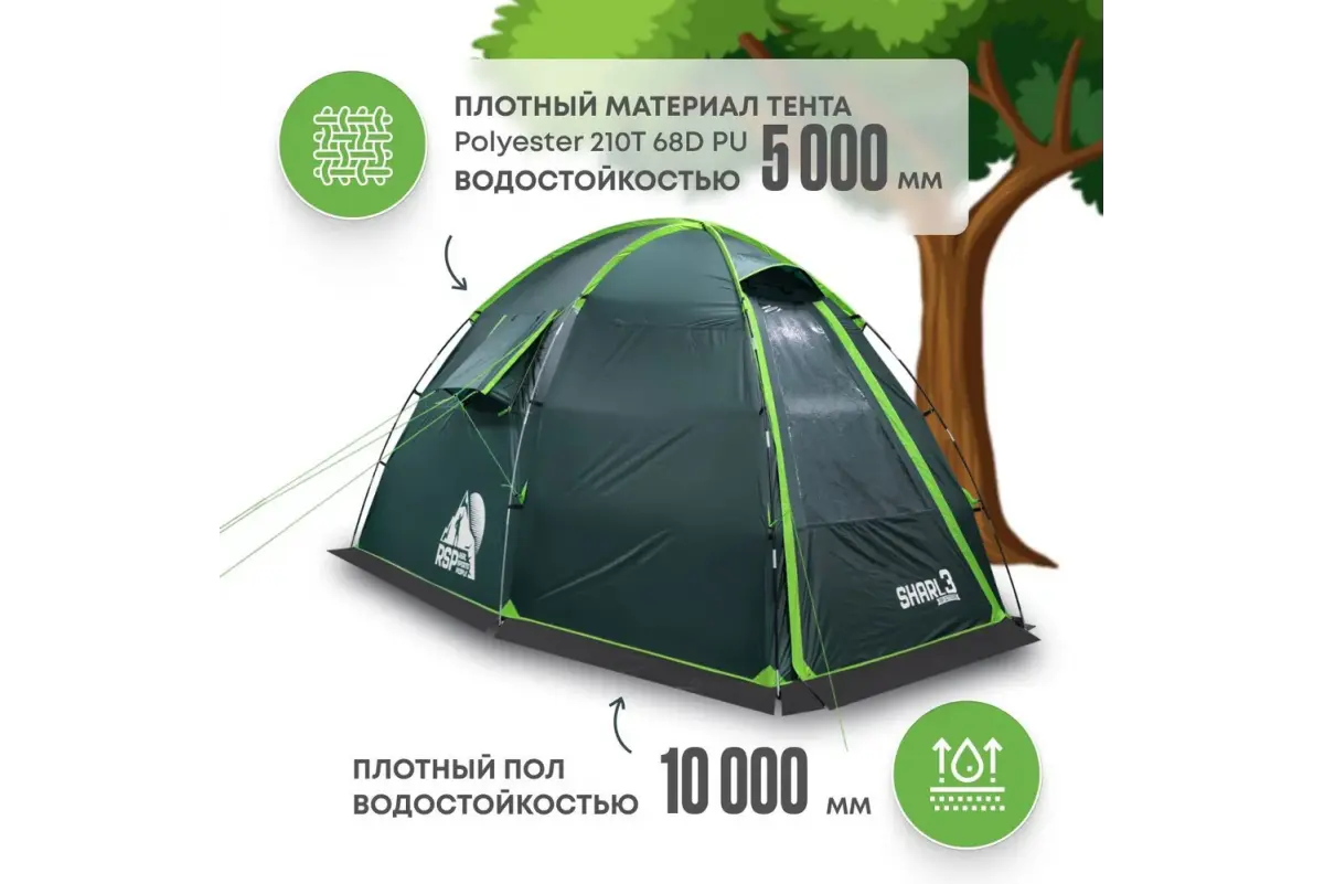 Палатка RSP Sharl 3 — это лучший выбор для комфортного и продолжительного отдыха на природе. В ней с комфортом может разместится 3 человека, а благодаря большому тамбуру будет много места для хранения вещей, организации кухни либо расположения стола и стульев. Эта палатка придется по вкусу многим любителям кемпинга т.к. сочетает в себе высокое качество материалов и продуманную эргономику.
