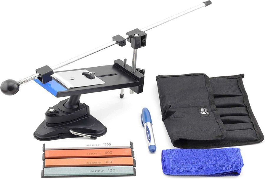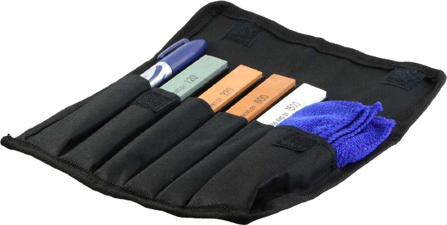 Такое разнообразие брусков диктуется типом зернистости, всего четыре – на 120, 320, 600 и 1500 единиц. Все они, а также синий маркер, хранятся в чехле-органайзере из кордуры. Кроме того, в наборе есть и мягкая салфетка. Инструкция с подробными схемами помогает разобраться в устройстве и сборке приспособления. С помощью шарнирного соединения станина крепится к конструкции, размещенной на подставке с присоской. Присоска фиксирует точилку на столешнице или любой плоской поверхности. При этом она должна быть не фактурной, а гладкой, иначе присоска не будет держаться. Лучше вариант – керамическая плитка.